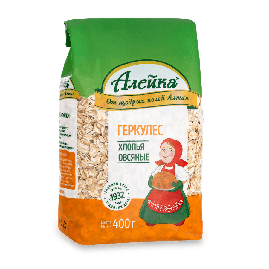 Овсяные хлопья Геркулес бренда "Алейка" - богатейший источник натуральной клетчатки, белков, витаминов, микроэлементов и других питательных веществ, жизненно необходимых нашему организму. Геркулес обладает мощными очищающими свойствами. Овсяная каша особенно полезна тем, кто подвержен переменам настроения, депрессии слабости или сонливости. Начините свой день с завтрака овсяной кашей и обеспечьте себя энергией на весь день! Хлопья производятся из натурального зерна путём его расплющивания в пластинки. Способствуют сохранению чувства насыщения, что несомненно, порадует людей, которые тщательно подходят к выбору продуктов для своего рациона питания. Овсяные хлопья Геркулес отличаются высоким содержанием витамина E и пищевых волокон. При желании хлопья можно использовать для выпечки печенья пирогов хлебцев хлеба и других хлебобулочных изделий, а также в качестве добавки в кефир и йогурт или кисель. Идеально для детей и полезно для взрослых. Как правильно варить: довести до кипения молоко или воду, по желанию рас