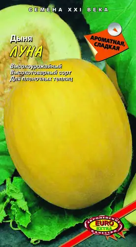 Дыня Луна (Cucumis melo L.) Среднеранний сорт для выращивания в весенне- летнем обороте пленочных теплиц. Растение среднеплетистое, главная плеть длинная. Лист среднего размера, зеленый, почковидный, цельнокрайний. Плод овальный, гладкий, со сплошной связанной нежной сеткой. Фон желтый, без рисунка. Кора тонкая, гнущаяся, на разрезе желтая. Мякоть кремовая, средней толщины, зернистая, малонежная, малосочная, умеренно сладкая, с ароматом дыни. Масса плода 1,1 кг. Вкусовые качества хорошие. Семенное гнездо малое, кремовое