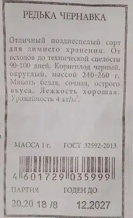 Высокоурожайный позднеспелый сорт для зимнего хранения. От всходов до технической спелости 90-100 дней. Корнеплоды ? 8-10 см и массой 240- 260 г. Мякоть белая, очень сочная. Ценность сорта: высокая урожайность (3,0-4,0 кг/ м2), выравненность корнеплодов, хорошая лежкость, устойчи- вость к низким температурам. Редька предпочитает солнечные участки с плодородными, в меру влажными, нетяжелыми почвами. В фазе одного – двух настоящих листьев сеянцы прореживают. Редьку можно выращивать в качестве повторной культуры после уборки раннего картофеля и листовой зелени – салата, укропа, кинзы.
