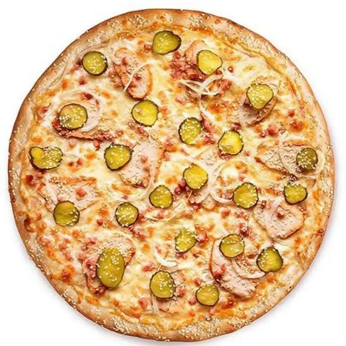 Состав: укроп, окорочка куриные, помидоры, сырный продукт, мука пшеничная в/с, вода питьевая, сахар, маргарин, масло растительное, огурцы сол.консерв, майонез, дрожжи прессов. ""Рекорд"", соль, соус томатный, мажимикс.  Пищевая ценность в 100 г продукта: Жиры: 18,36 г, Белки: 49,9 г, Углеводы: 18,2 г, Калорийность: 437,64 ккал.