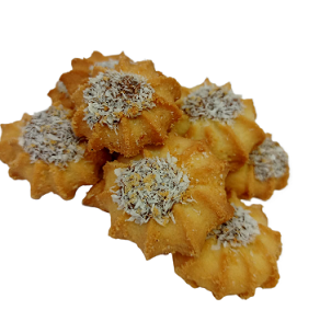 Состав: мука пшеничная в/с, маргарин, сахар, вода питьевая, глазурь кондитерская, меланж яичный, кокосовая стружка. Пищевая ценность в 100 г продукта: Жиры: 29,7 г, Белки: 6,6 г, Углеводы: 55,4 г, Калорийность: 515,3 ккал.