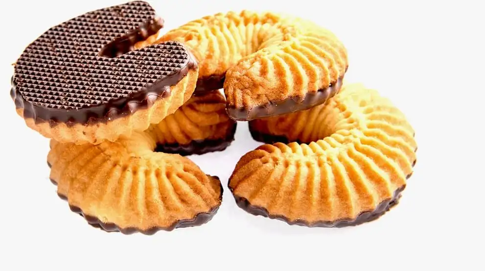 Состав: мука пшеничная в/с, маргарин сахар., вода питьевая, меланж яичный. Пищевая ценность в 100 г продукта: Жиры: 12,7 г, Белки: 7,2 г, Углеводы: 59 г, Калорийность: 379,1 ккал.