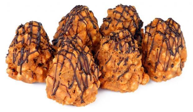 Состав: арахис, молоко сгущенное вареное, мука пшеничная в/с, маргарин, сахар, сметана, глазурь кондитерская. Пищевая ценность в 100 г продукта: Жиры: 13,2 г, Белки: 12,1 г, Углеводы: 58,8 г, Калорийность: 402,4 ккал.