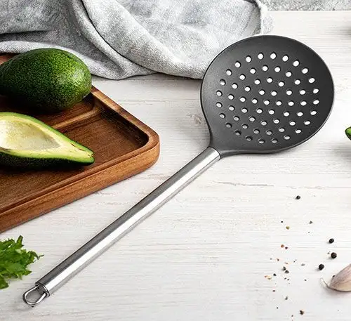 Изготовленная из прочной нержавеющей стали и термостойкого пластика, она выдерживает температуры до 210°C, что делает ее надежным инструментом для приготовления различных блюд. Удобная ручка с отверстием для подвешивания обеспечивает легкость хранения.