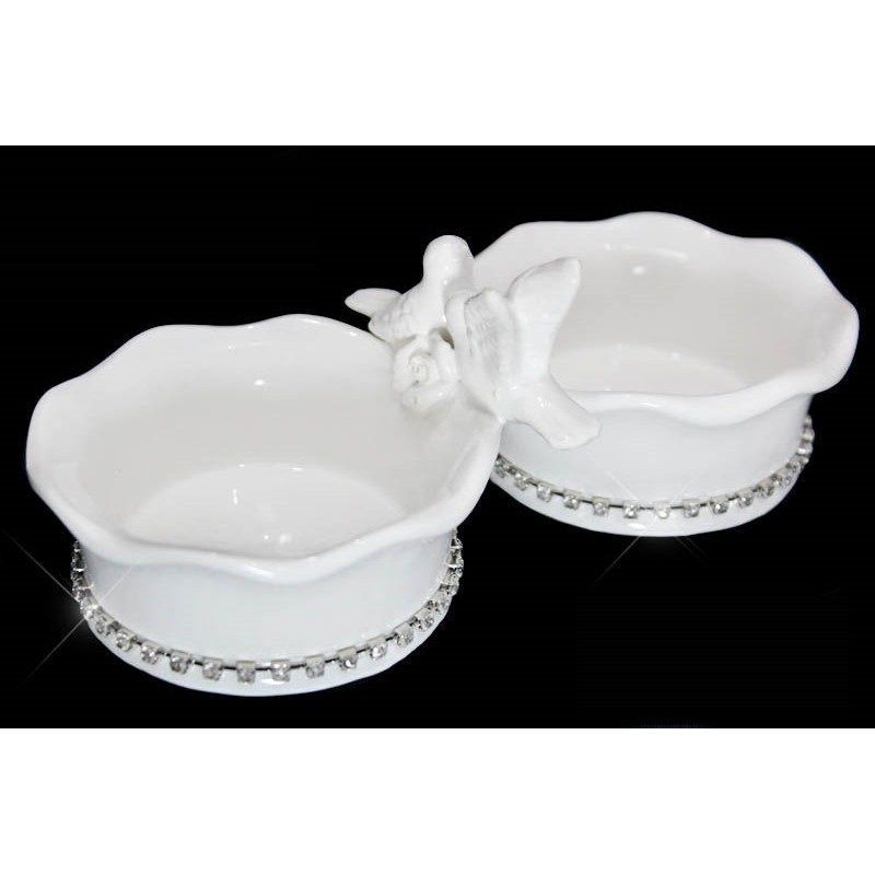 Коллекция ГОЛУБЬ И ГОЛУБКА изготовлена из облегченной керамики. Высококачественная белоснежная глянцевая глазурь добавляет долговечность и высокий эстетический вид. Борт посуды украшен лентой из страз и парой влюбленных голубей. Коллекция состоит из различных предметов сервировки Упаковано в подарочную коробку Материал: керамики Не рекомендуется использовать в микроволновой печи и мыть в посудомоечной машине, по причине возможного повреждения декоративных элементов.