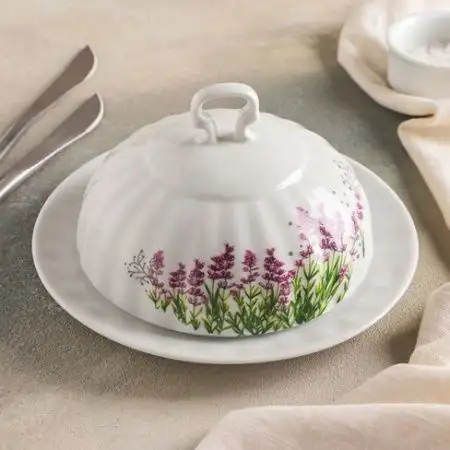 Эта масленка круглой формы, изготовленная на Добрушском фарфоровом заводе, станет незаменимым аксессуаром на вашей кухне. Сделанная из классического твердого фарфора и украшенная изящным рисунком, она прекрасно сохранит свежесть масла и придаст вашим блюдам эстетичный вид. Масленку также можно использовать для хранения сыра или колбасы, а благодаря своему стильному дизайну, она станет отличным украшением вашего стола. Ее объем составляет 500 мл, а диаметр поддона - 18 см. Эта масленка не только практична, но и красива, поэтому она станет отличным подарком для любого гурмана.