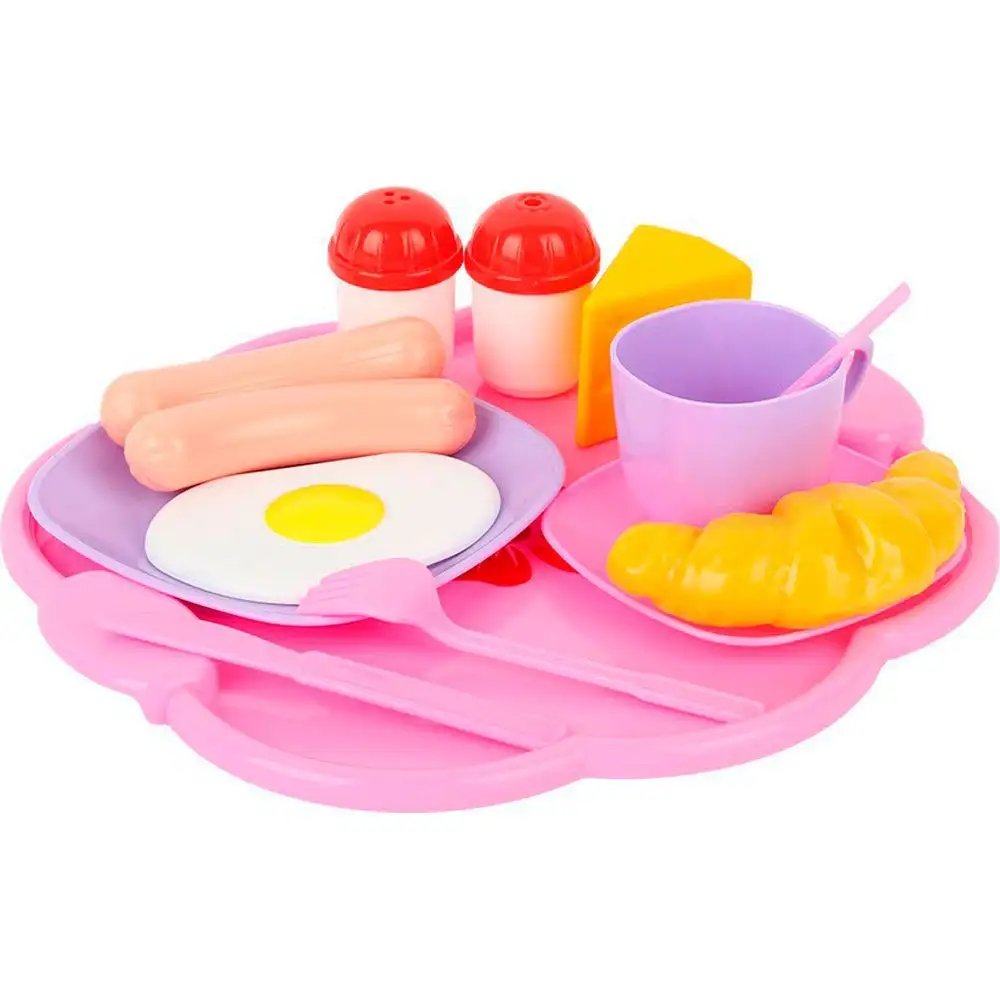 В состав набора входят: поднос, яичница, сыр, чашка, ложка, вилка, нож, блюдце, тарелка, солонка, перечница, сосиски 2шт., круассан