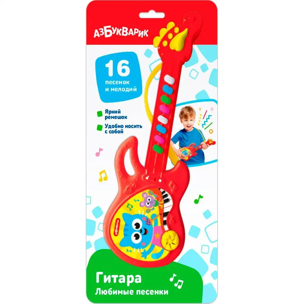 Эта игрушечная гитара отличается оригинальным дизайном – она выглядит, как настоящая гитара для профессиональных музыкантов! Дети будут в восторге!Нажимая на разноцветные кнопочки на грифе гитары, ребенок послушает детские хиты в современной аранжировке: 8 песенок («Чунга-чанга», «Песня Львёнка и Черепахи», «Весёлые путешественники», «Весёлая карусель», «Какой чудесный день!», «Щенок», «Лошадка», «Два весёлых гуся») и 8 мелодий («Арам зам зам», «Улыбка», «Чижик-пыжик», «Калинка», «Песенка про кузнечика», «Собачий вальс», «Песенка фермера», «Танец маленьких утят»).Устроить концерт для семьи и друзей – это так весело! У гитары есть ремешок – благодаря этому ее удобно всюду носить с собой.