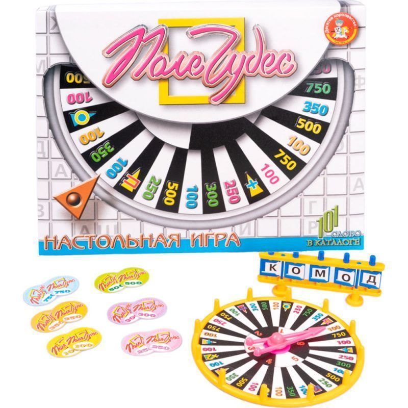 Известная на всю Россию телепередача «Поле чудес» (принять участие в которой наверняка мечтал каждый телезритель) теперь доступна и в формате настольной игры благодаря производителю игрушек «Десятое королевство». Состав: • рулетка – 1 шт. (диаметр – 18,5 см) • игровое поле – 1 шт. (45 х 35 см) • табло – 4 шт. • фишки картонные – 28 шт. (диаметр – 4,3 см) • карточки букв – 2 комплекта (2 х 2 см) • инструкция – 1 шт. Игра предназначена для детей от 3 лет и рассчитана на 2-4 игроков. Как играть? Набор содержит 44 увлекательные, а главное, познавательные темы, 2 варианта игры и более 1000 умных слов, которые значительно расширят словарный запас ребенка. В первом варианте «Поля чудес» можно разделиться на две команды и устроить соревновательный турнир. Второй вариант игры ничем не отличается от классической игры с ведущим. Составление вопросов и разработка вариантов игры: Олеся Емельянова. «Десятое королевство» является обладателем лицензии на производство продукции под товарным