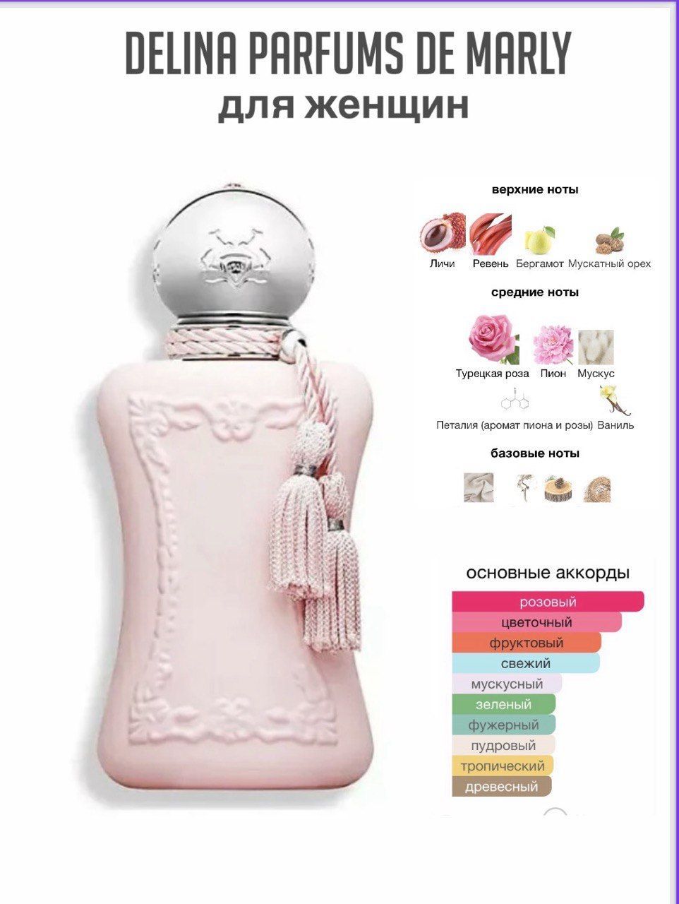 Нежный, чувственный, ласковый аромат для изысканных, элегантных молодых леди. С первых нот парфюм восхищает весенней свежестью ревеня, дополненной горьковато-зелеными акцентами бергамота, экзотичной, самобытной сладостью личи и вкраплениями пряных нот мускатного ореха.