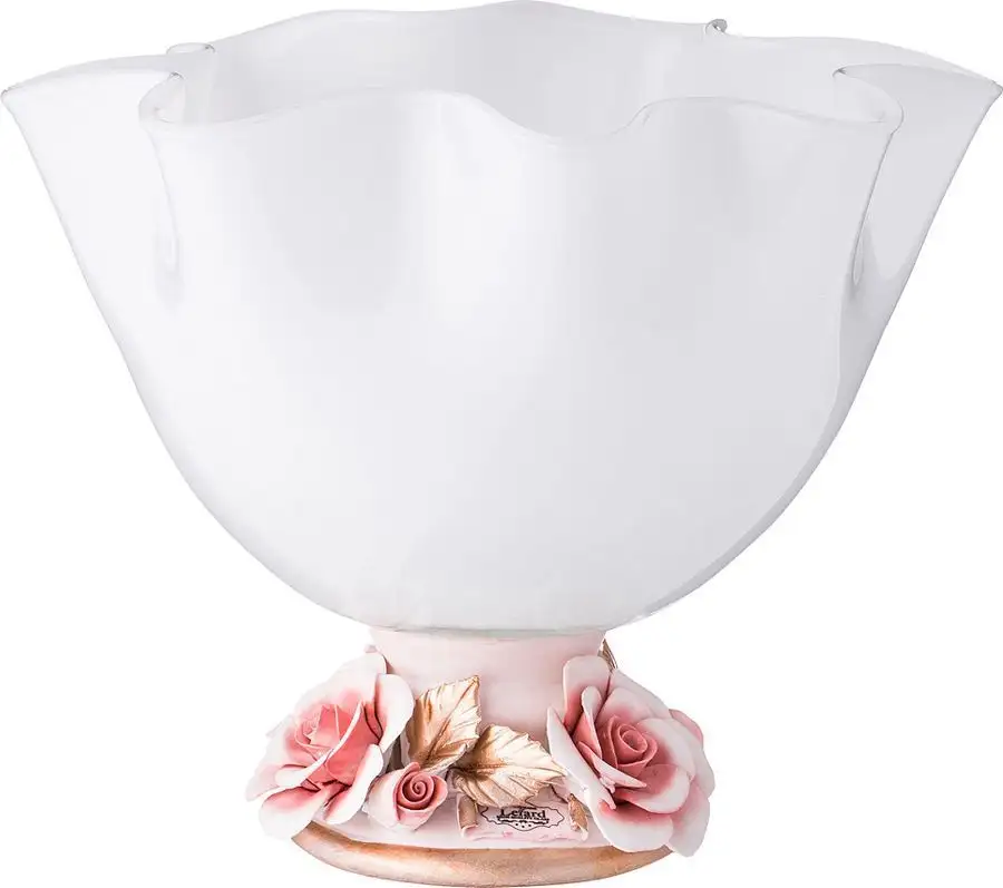 Ваза сочетает в себе элементы стекла и керамики, что придаёт ей особый декоративный вид. Ручная работа подчёркивает уникальность каждого экземпляра. Модель подходит для создания интерьерных композиций, размещения цветов или использования как самостоятельный элемент декора.