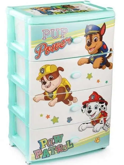 Современный и функциональный комод, декорирован образами персонажей популярного мультсериала Щенячий Патруль. Изделие способно гармонично вписаться в интерьер любой детской комнаты. При производстве изделия используется только сертифицированное и экологически чистое, качественное сырье отечественных и зарубежных производителей. Комод имеет четыре широких выдвижных ящика большой вместимости, в которых будет очень удобно хранить постельное белье, канцелярию, одежду и игрушки ребенка. Изделие оборудовано колесиками на ножках, благодаря чему его с легкостью сможет передвинуть даже ребенок.